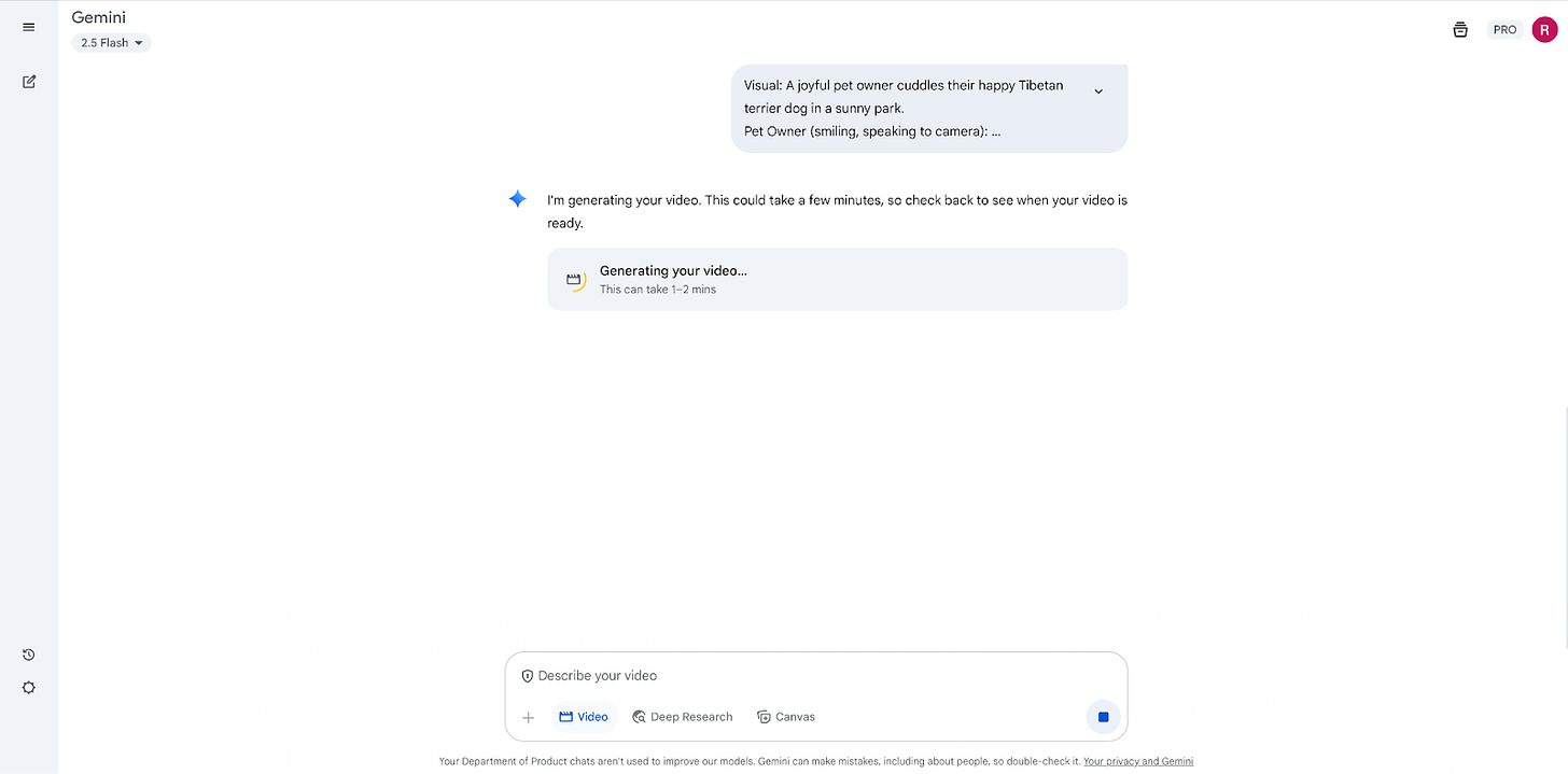 Veo 3 is the leading text-to-video generation model and for this example, we’re using the native Gemini web app which now comes with the ability to generate 8 second videos.