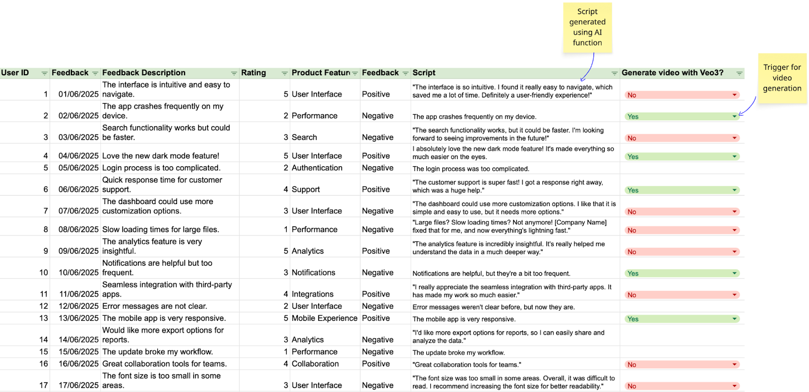 For example, you could link this to your customer feedback spreadsheet and create a video based on real world user feedback. In this Sheet, we’re using the AI function to generate a script based on real world feedback: