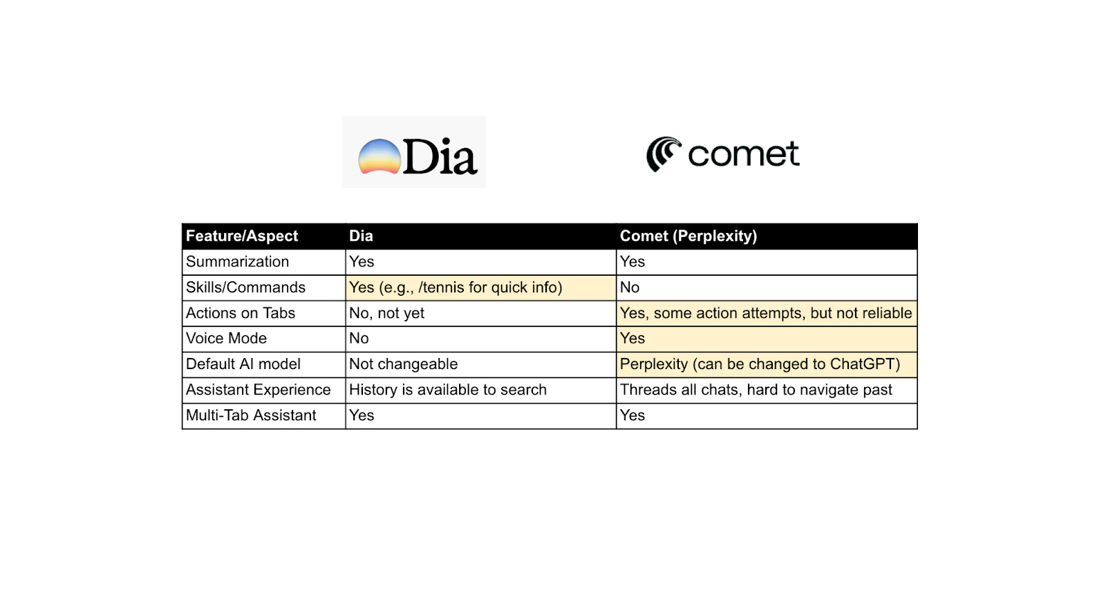 Both have similar capabilities like multi-tab assistants and AI summarization but while Dia has the ability to create custom skills, Perplexity’s Comet does have a major feature that Dia currently lacks: agentic actions.