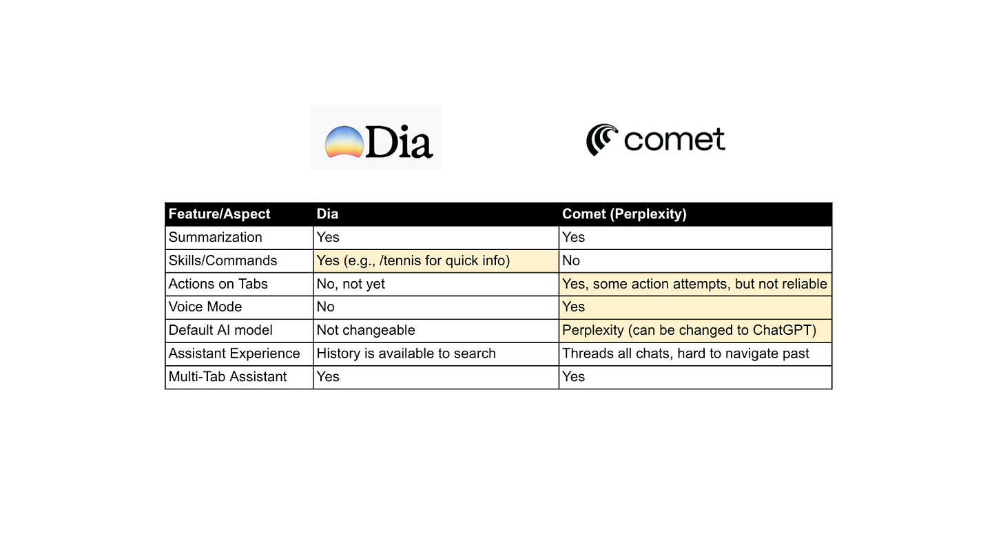 Here’s a snapshot of how Perplexity stacks up against another AI browser, Dia: