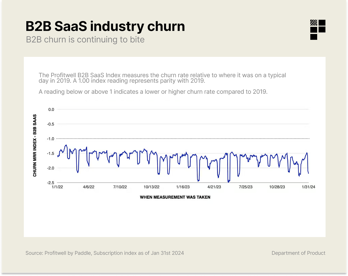 The Profitwell B2B SaaS index measures churn at an industry level with data from over 34,000 companies.