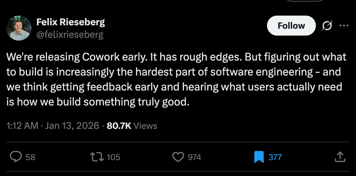 The new product is a fine example of Anthropic doing what top product teams do in 2026. They shipped a product (Claude Code), realised that non-engineers found value in it and used that data to inform an entirely experimental new sub-product with Claude Cowork that takes the utility of Code but repackages it into something that is more suitable to its new user segment.