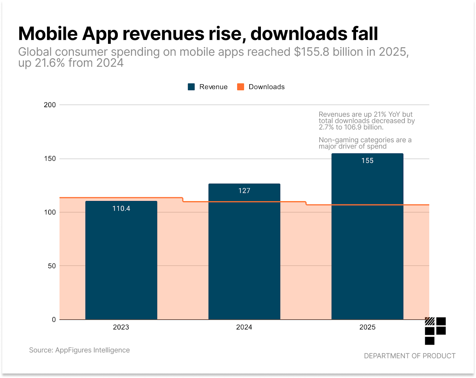 Global consumer spending on mobile apps reached $155.8 billion in 2025, up 21.6% from 2024. But, downloads decreased by 2.7% to 106.9 billion, down from 109.8 billion in 2024 and 113.6 billion in 2023. With downloads declining but revenue up 21.6%, the data suggests that acquisition volume is becoming less important than monetization effectiveness.