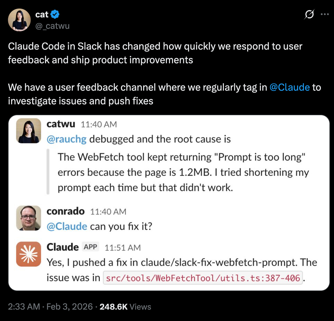 Claude Code’s product manager Cat Wu says that the introduction of Claude Code in Slack has changed how quickly they respond to user feedback and ship product improvements. Anthropic has a user feedback channel where they regularly tag in Claude to investigate issues and push fixes.