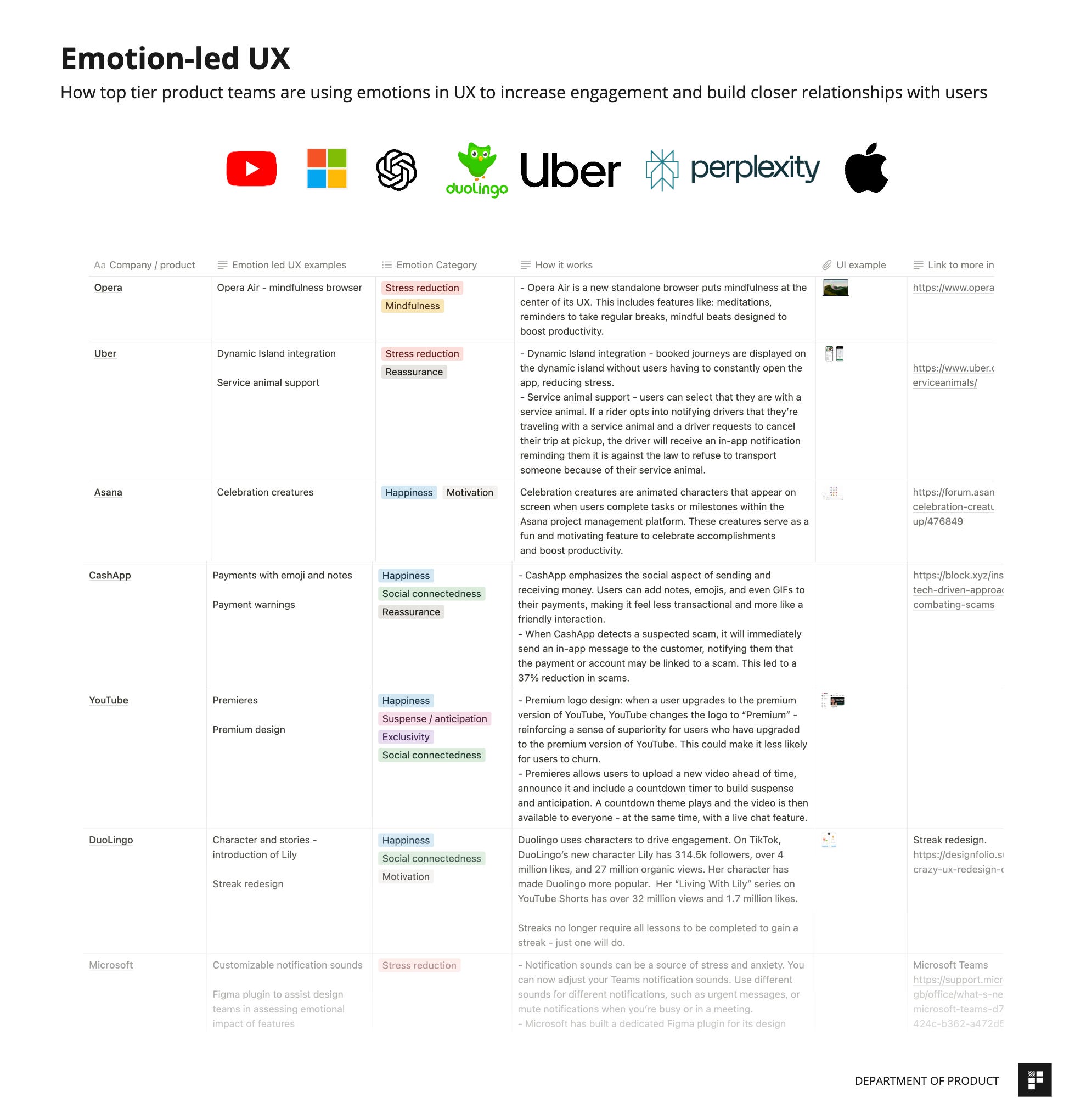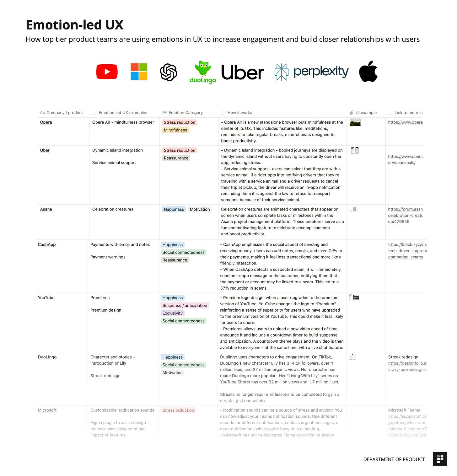The full breakdown of 30+ emotion-led features and UX from leading companies including Apple, ChatGPT, Spotify, YouTube, DuoLingo, Uber and more - all categorized by emotional impact.