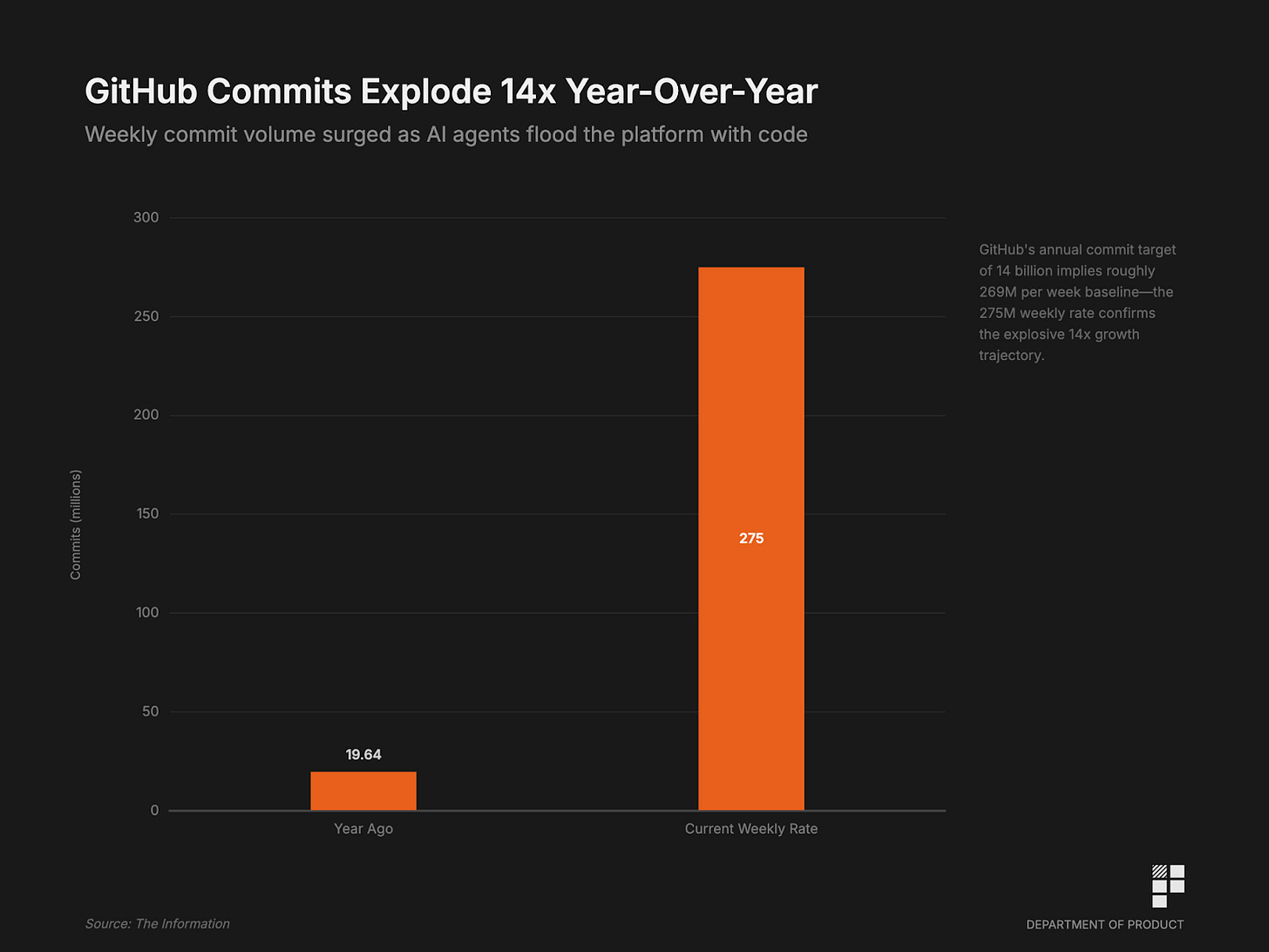 GitHub Commits have exploded 14x year on year to reach 275 million commits per week as AI agents take over. AI pull requests have quadrupled in the last six months, up from 4 million to 17 million and Claude Code authored commits have grown from 100,000 six months ago to 2.5 million last week: