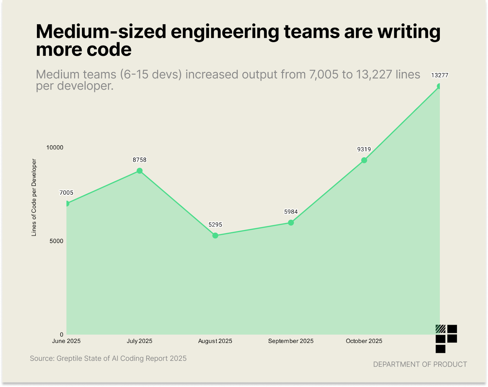 The number of lines per developer has grown from 4450 to 7839 in 2025 and medium-sized teams with 6-15 developers have increased their output from 7005 lines to 13,227 lines. Measuring teams based on the number of lines of code generated isnât a reliable proxy for adding value to users but it likely shows the multiplier effect of AI-augmented engineering teams.