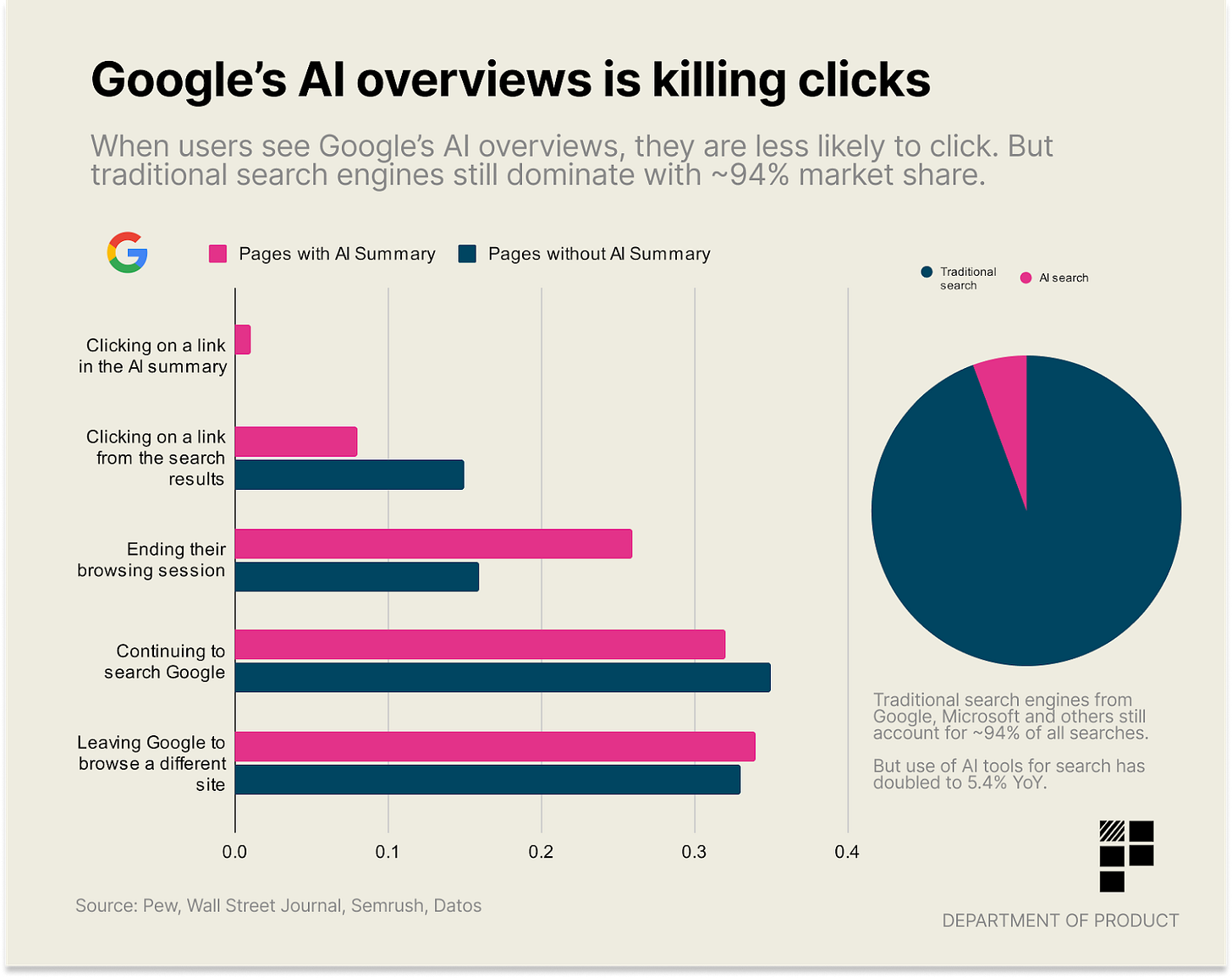 AI continues to destroy traditional SEO. A new study from Pew shows that Google users who encounter an AI summary are less likely to click on links than those who donât. Just 8% of users who saw a page with an AI summary clicked on a link vs 15% who didnât. 26% of users ended their browser session after seeing the AI summary vs just 16% who saw pages without the summary.
