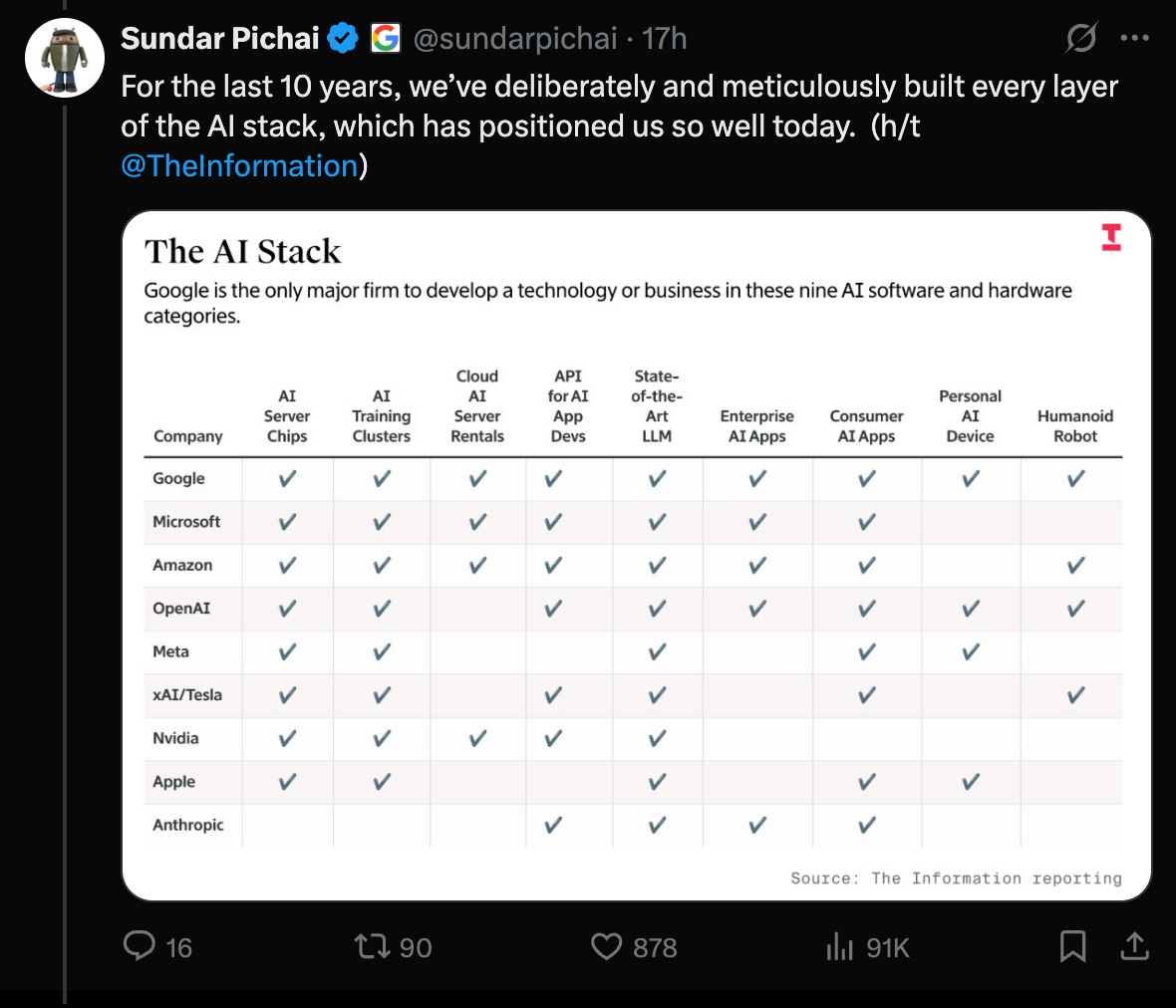 This week, Google delivered an impressive earnings call that told a curious tale of a company that is both destroying itself and winning at the same time. Their CEO took their earnings call this week as an opportunity to position Alphabet as the company best placed strategically to win across each of the important AI dimensions. Is he right?