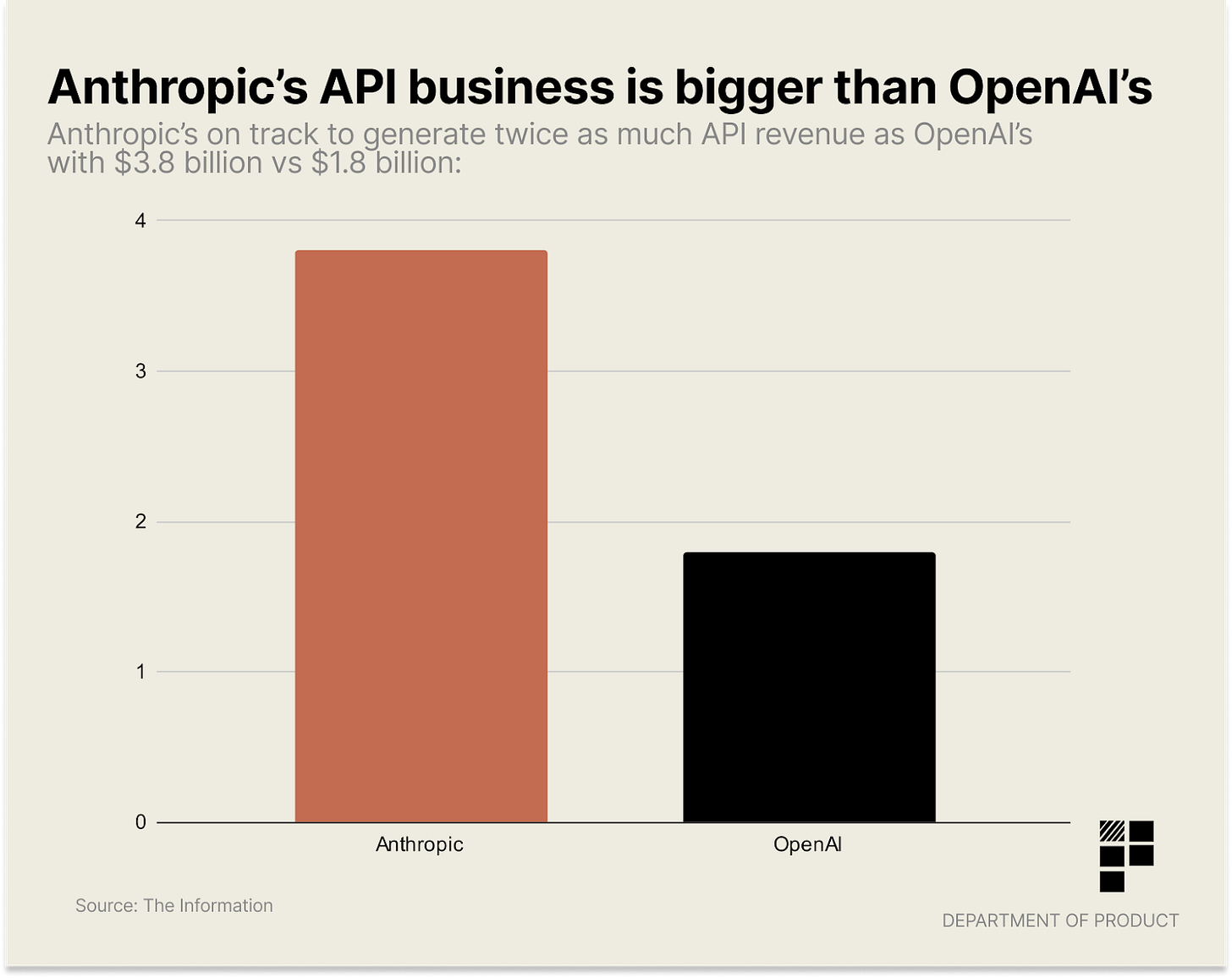 Anthropic predicts that its API business will generate twice as much revenue as OpenAIâs with revenues of $3.8 billion this year vs $1.8 billion: