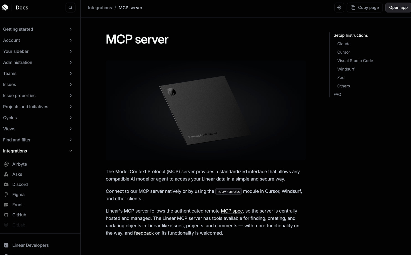 This is pretty self explanatory. It explains what MCP is and how it works. For Linear users, it means they can access their data through an AI model or Agent.
