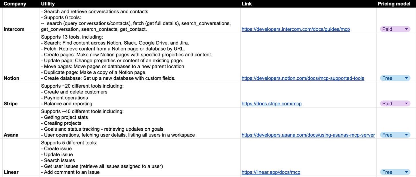 Hereâs a snapshot of some of the recent MCP servers recently released by top companies including Linear, Notion, Stripe and others, along with their pricing models and links to further info: