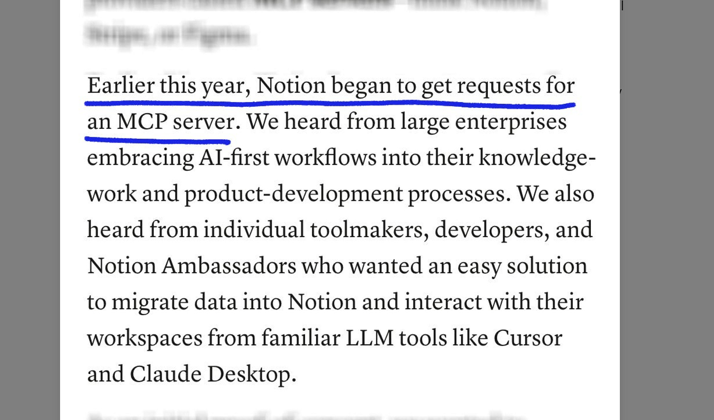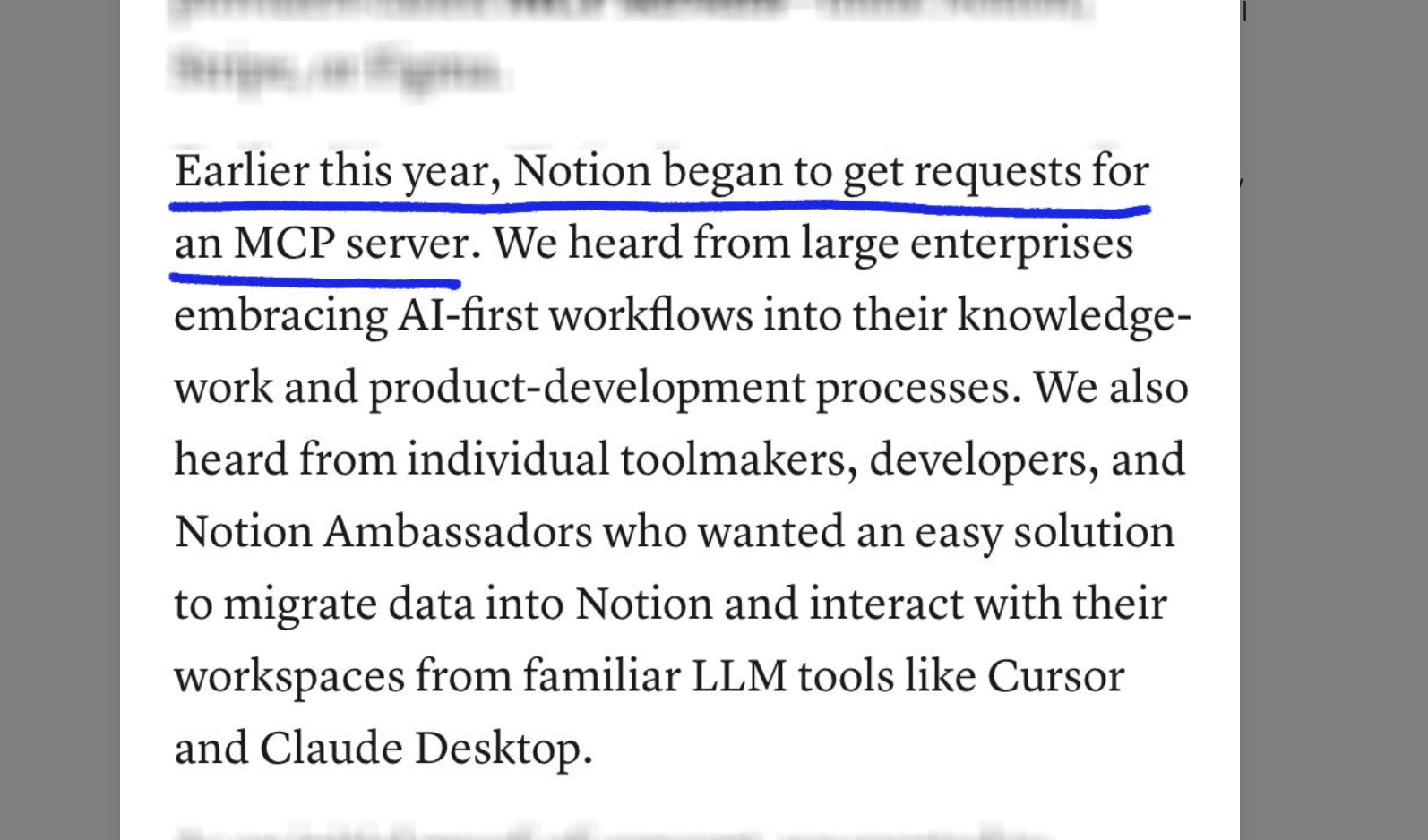 Notion has become the latest major company to release its own fully hosted MCP server. Over on their engineering blog, they say that an MCP server was a heavily requested feature from their enterprise customers as well as smaller creators:
