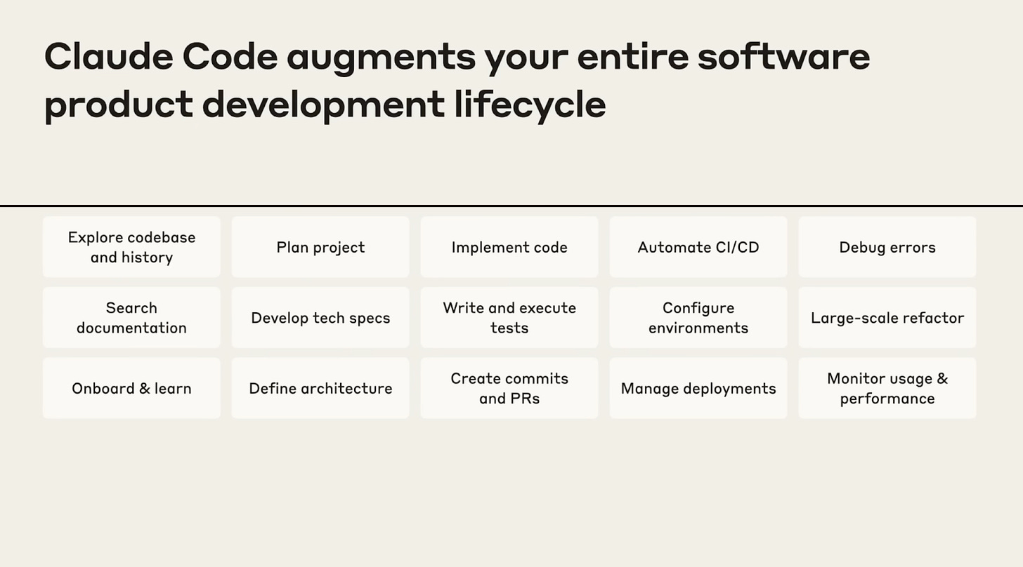 Hereâs a slide from a recent talk given by Anthropic which outlines all of the opportunities for using Claude Code to augment your software engineering lifecycle: