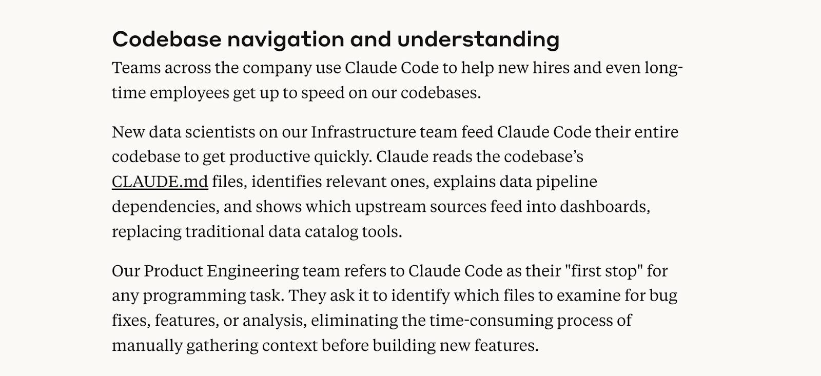 In Claude Code, engineers can get up to speed very quickly in ways that were previously impossible. It can now scan entire codebases with a massive context window, including full project structures and dependencies which make it possible for engineers to use tools like Claude Code to simply ask questions about how a codebase works.
