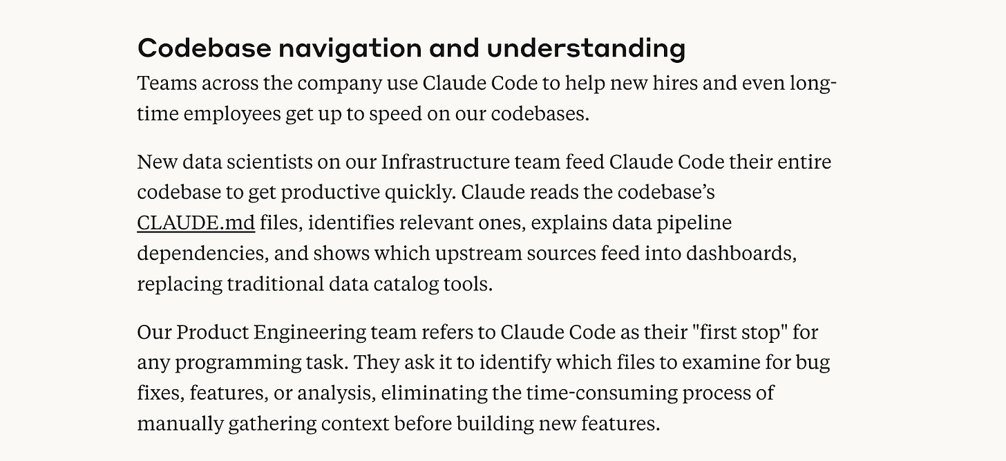 In a recent post outlining how Anthropicâs own engineering teams use Claude Code at work, they explain that Claude Code is now the de facto place for their new hires to go to get up to speed (perhaps unsurprising given that this is an Anthropic product!):