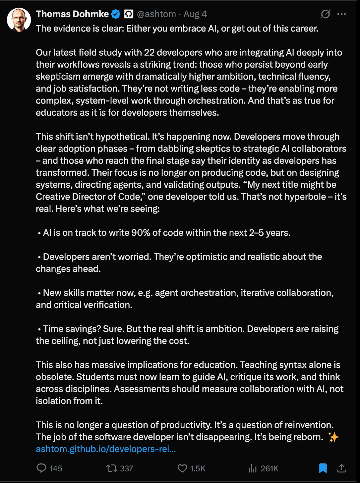 But whatâs most interesting to me from his tweet is the part where he talks about the different stages that developers move through when adopting AI. The first stage is where he describes engineers as a âdabbling sceptic,â before eventually moving into a final stage where developers who have persevered describe the shift as transformational.