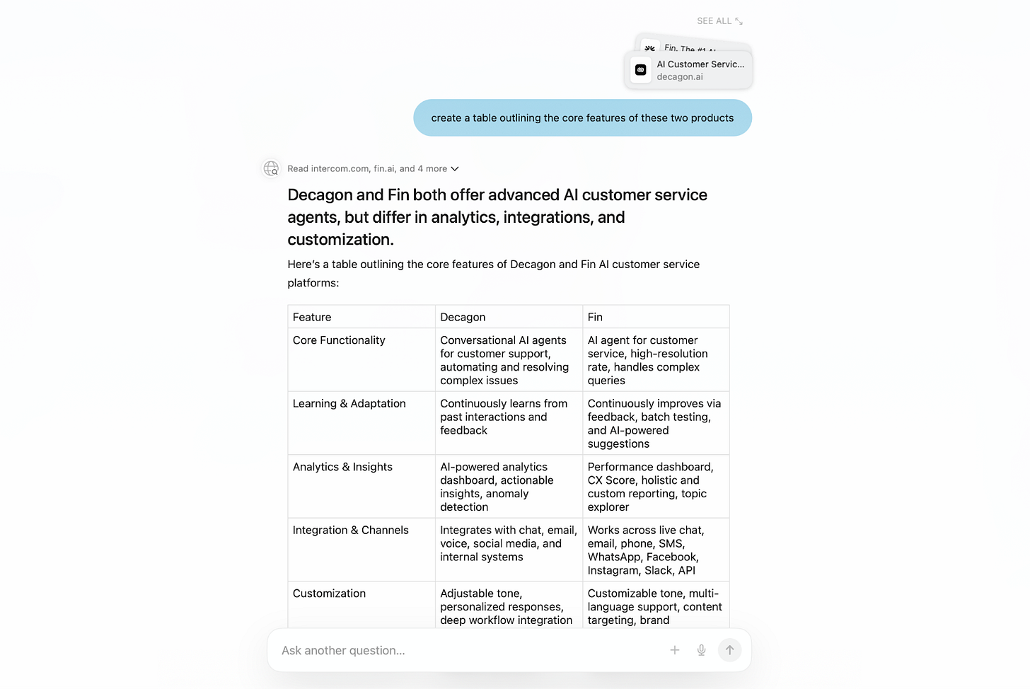 With these two browser tabs open, you can ask an AI browser to reference both of these open tabs and create a comparison table outlining the core features of the two products.