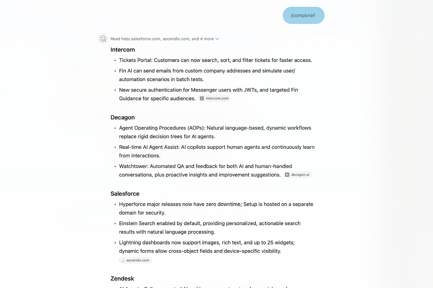 /compbrief creates an on-demand list of new features released and /comp-pod will find recent podcast appearances by their leadership teams:
