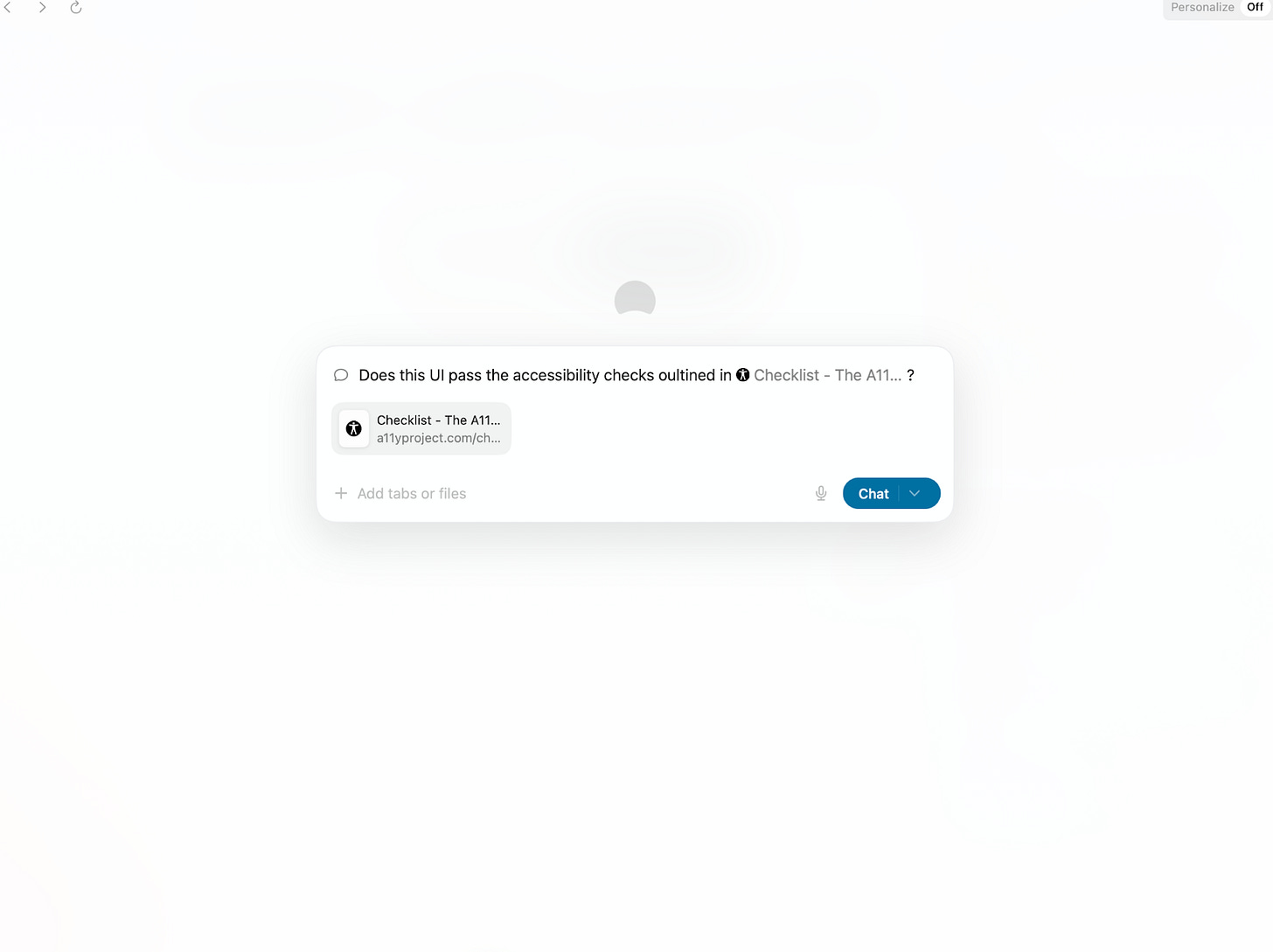 Accessibility checks are an opportunity here, too. In this example, I’ve visited a website that outlines accessibility checks and asked the browser to check an uploaded UI (in this case a snippet from Apple’s Liquid Glass on Apple Music) to see if it passes the criteria outlined.