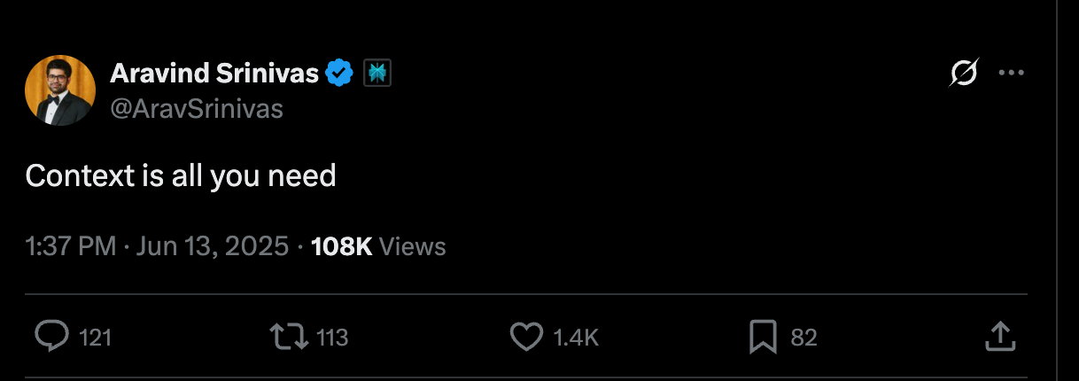 Contextual awareness is at the heart of the power of AI browsers. A few days ago, Perplexity’s CEO made reference to this in relation to their upcoming new browser, Comet, with a simple tweet that read “context is all you need”: