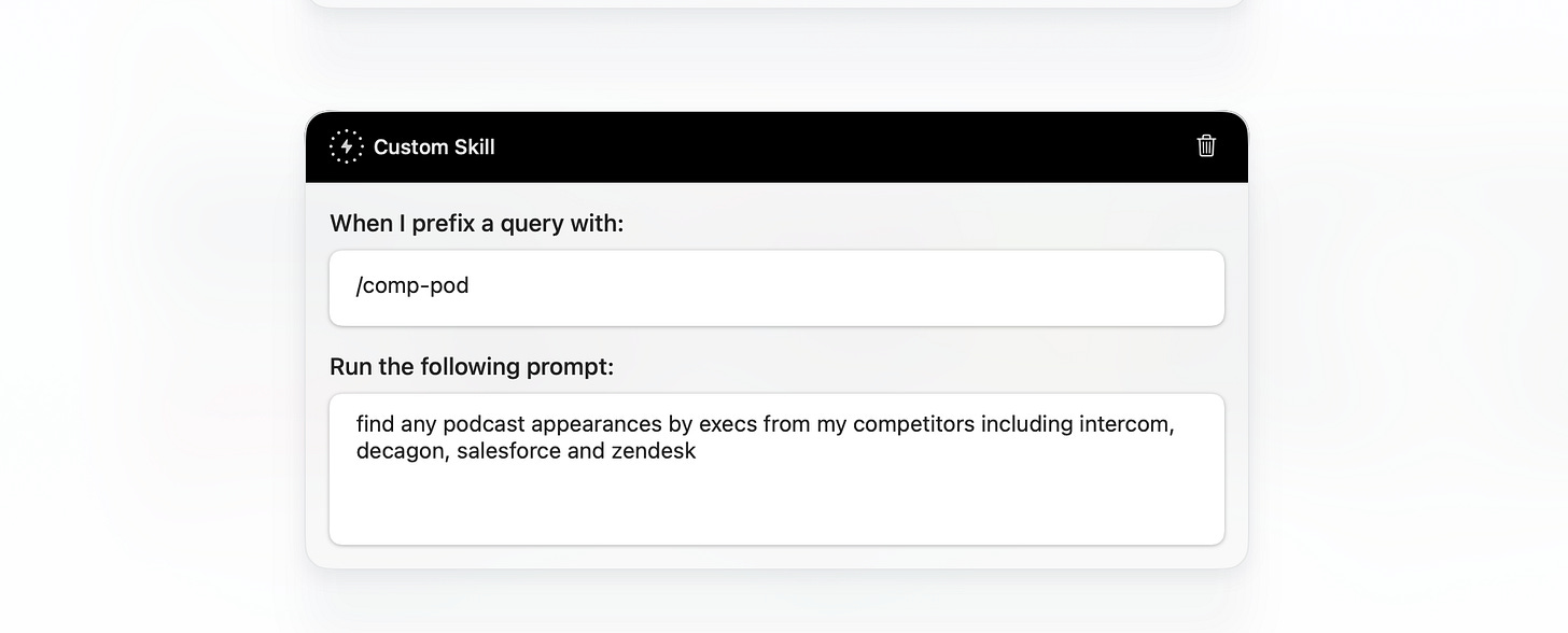 Skills can also be used to create your own personal competitor digest. With these skills you can quickly grab a list of all the new features released by your competitor and even keep tabs on the opinions of competitor’s leadership teams by finding recent podcast appearances: