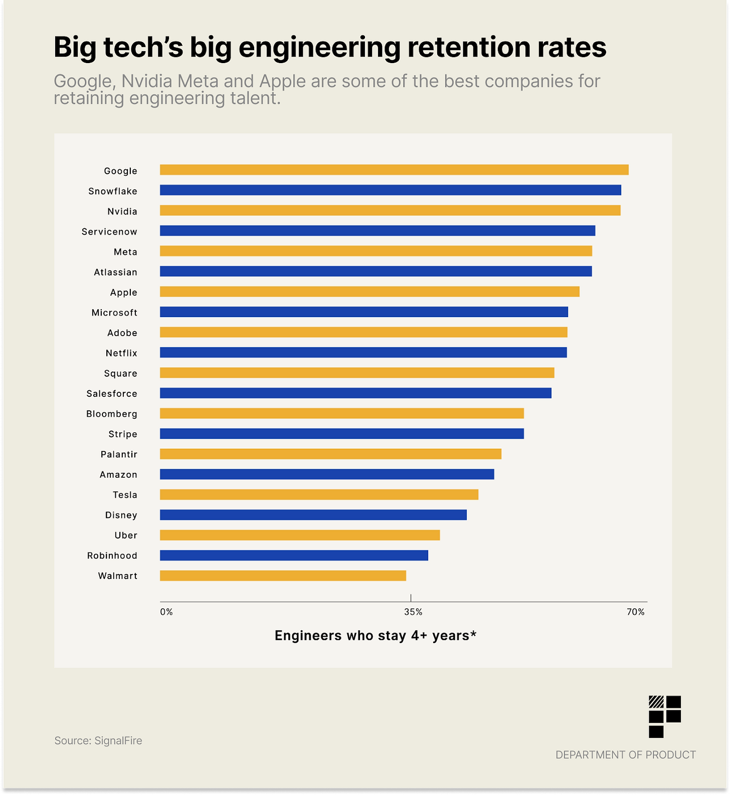 Google, Nvidia, Meta and Apple are some of the best companies for retaining engineering talent. Anthropic, OpenAI, and Meta are growing engineering teams 2-3x faster than they’re losing them, while Tesla, Bloomberg, and Walmart are losing talent faster than they can hire.