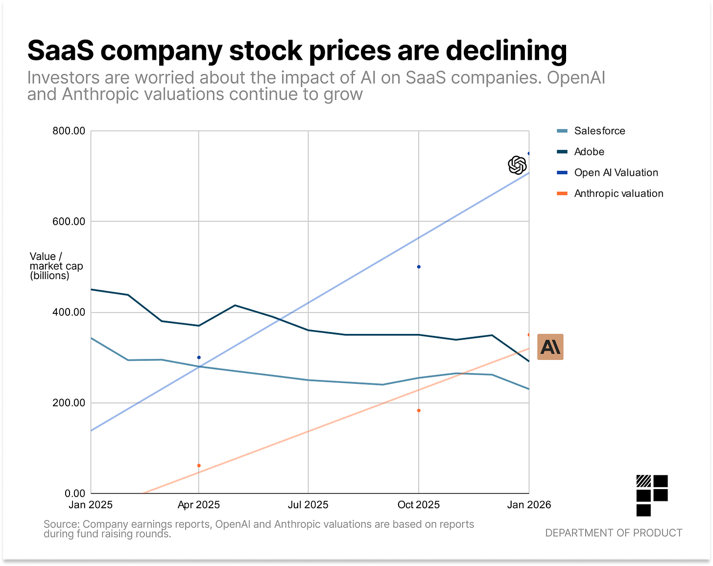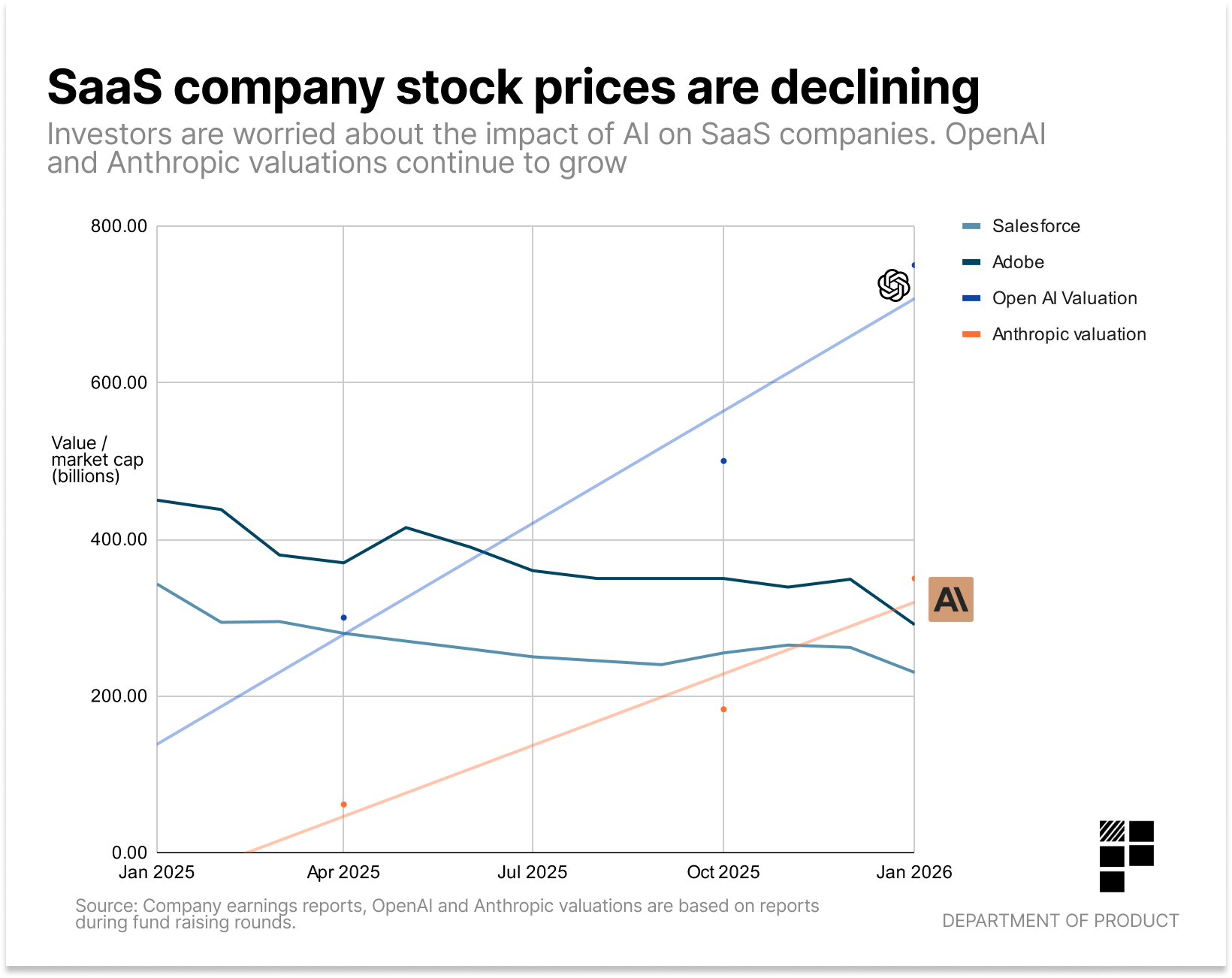 AI and vibe coding is accelerating the decline of software stock prices. Figma is down 80% since its IPO and new analysis in the WSJ shows Salesforce, Adobe, and ServiceNow have lost 30%+ of their value since early 2025.